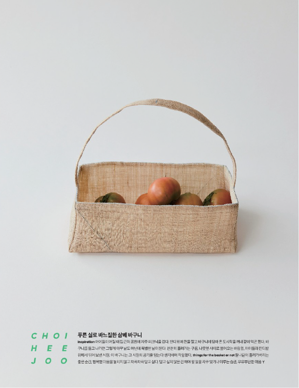 "아이들이 어릴 때 집 근처 공원에 자주 피크닉을 갔어요. 잔디 위에 천을 깔고 바구니에 담아온 도시락을 꺼내 같이 먹곤 했어요. 바구니를 들고 나가면 그렇게 아무 날도 아닌데 특별한 날이 돼요. 천천히 흘러가는 구름, 나뭇잎 사이로 불어오는 바람결, 아이들과 잔디밭 위에서 뛰며 보낸 시절. 이 바구니는 그 시절의 공기를 담는다 생각하며 작업했습니다."