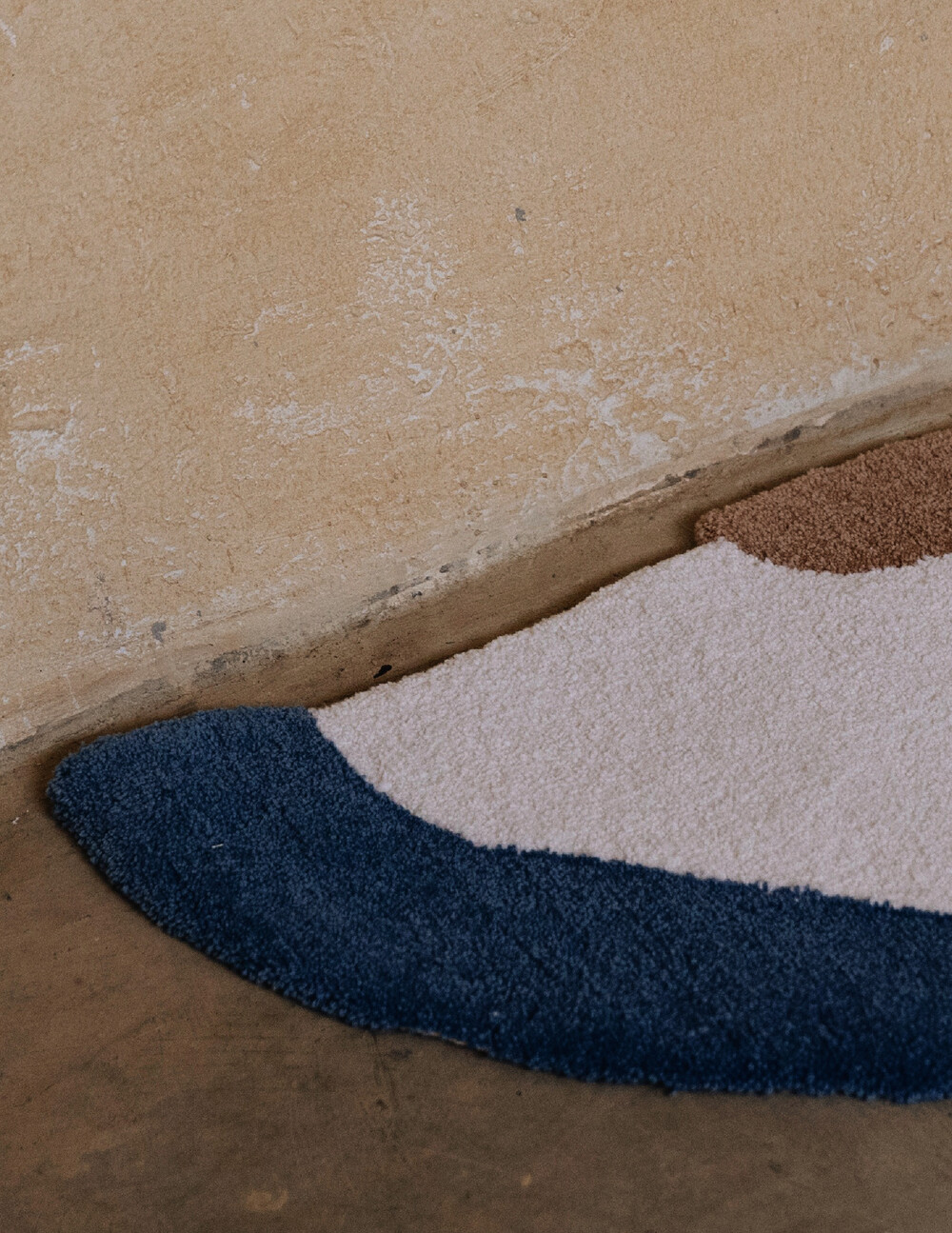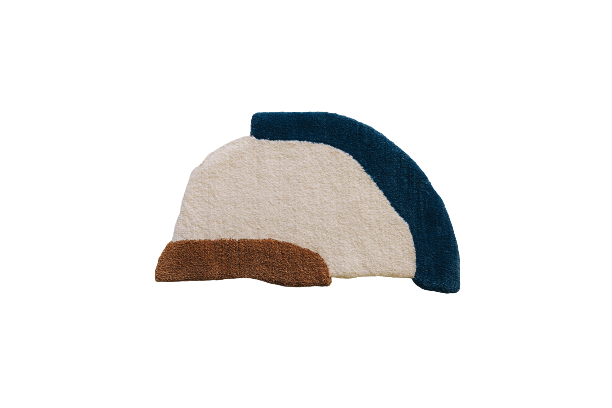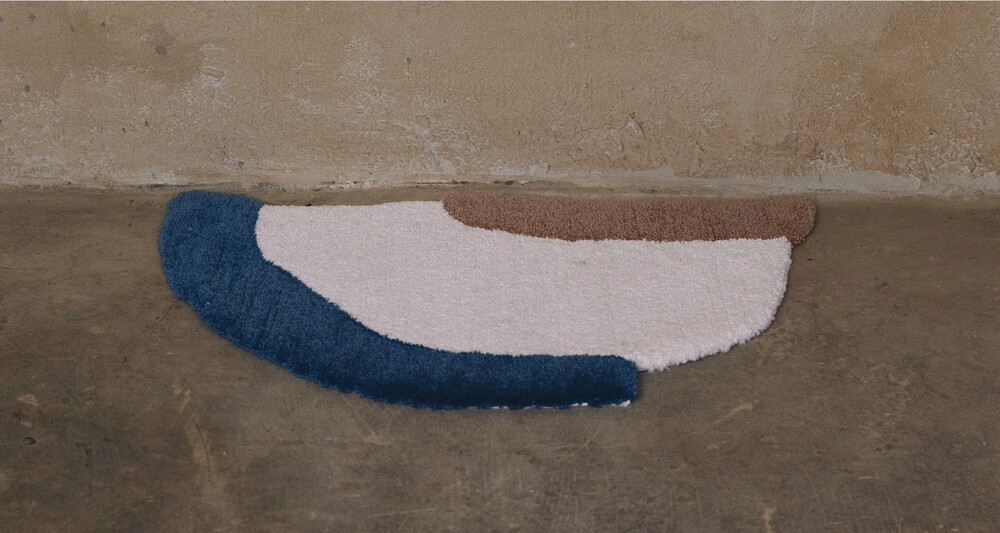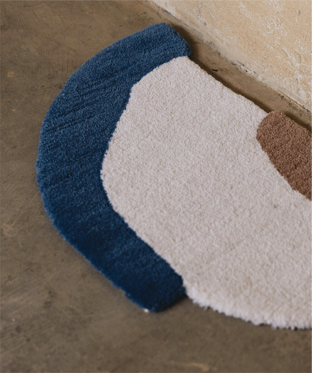 J : 호수의 잔잔한 물결, 물방울이 호수 위로 떨어졌을 때의 파동을 심플한 패턴으로 표현한 오브제입니다. 호수에 발을 담궜을 때 생기는 물결 같기도 하죠. 물에 편안히 잠기는 듯한 느낌을 내기 위해 울 100% 실에 터프팅 기법을 적용해 볼륨을 주었습니다.