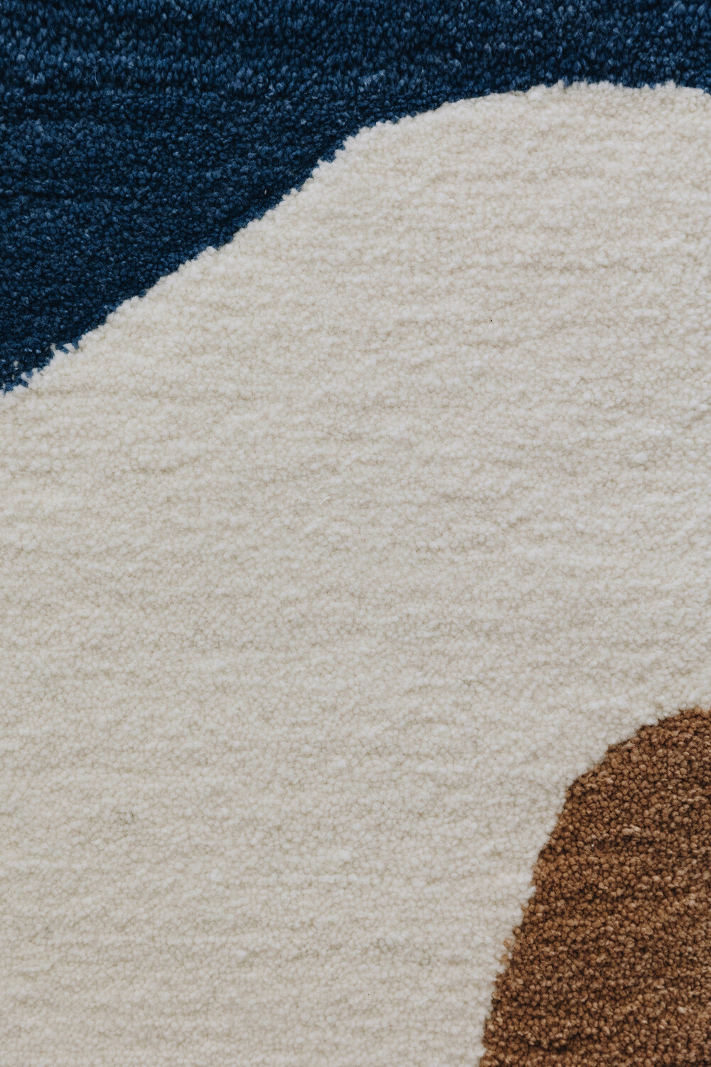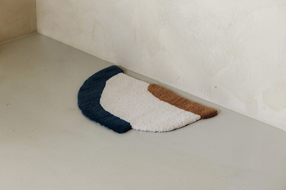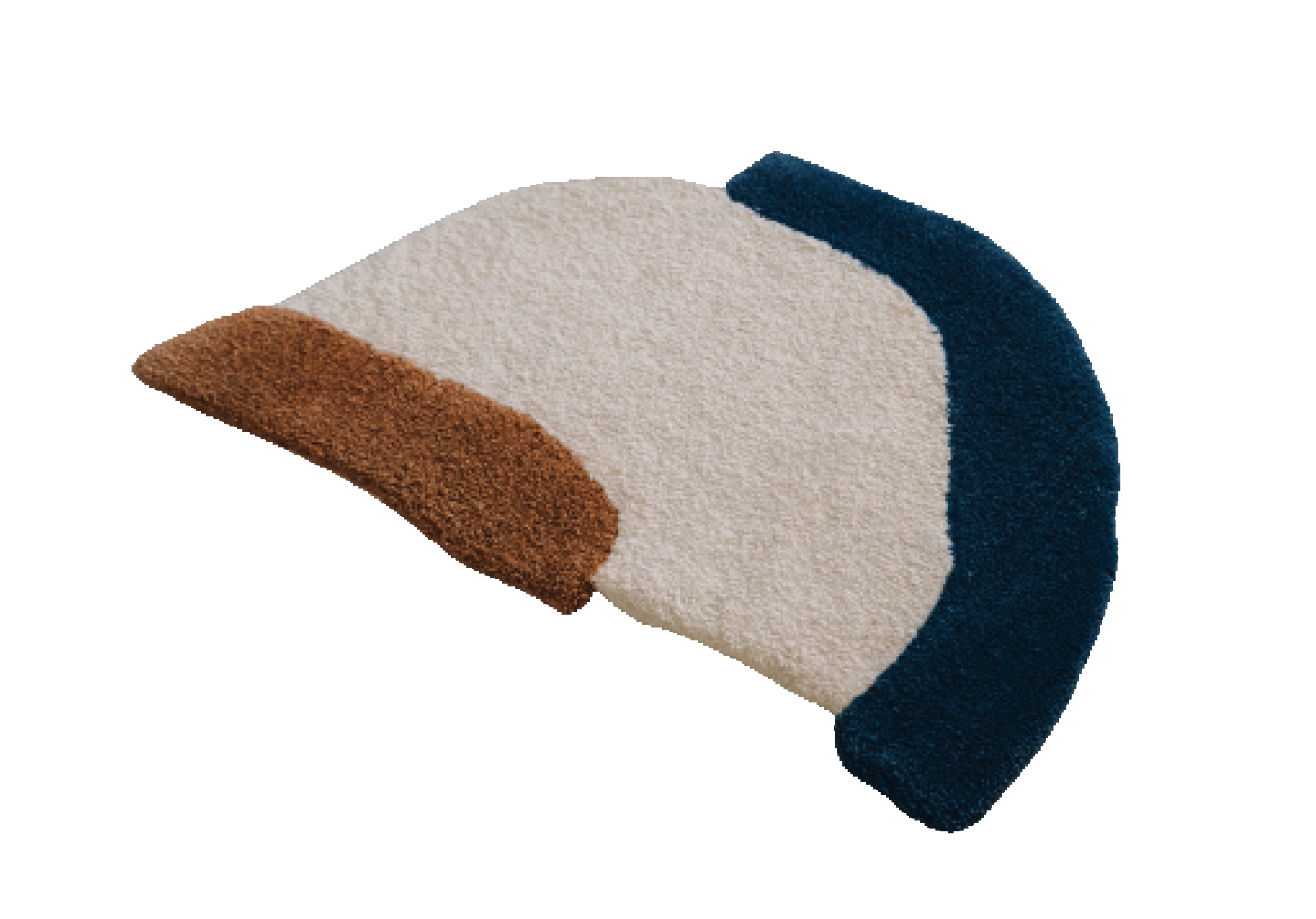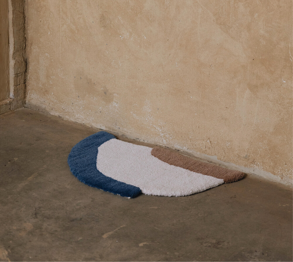 J : 호수의 잔잔한 물결, 물방울이 호수 위로 떨어졌을 때의 파동을 심플한 패턴으로 표현한 오브제입니다. 호수에 발을 담궜을 때 생기는 물결 같기도 하죠. 물에 편안히 잠기는 듯한 느낌을 내기 위해 울 100% 실에 터프팅 기법을 적용해 볼륨을 주었습니다.