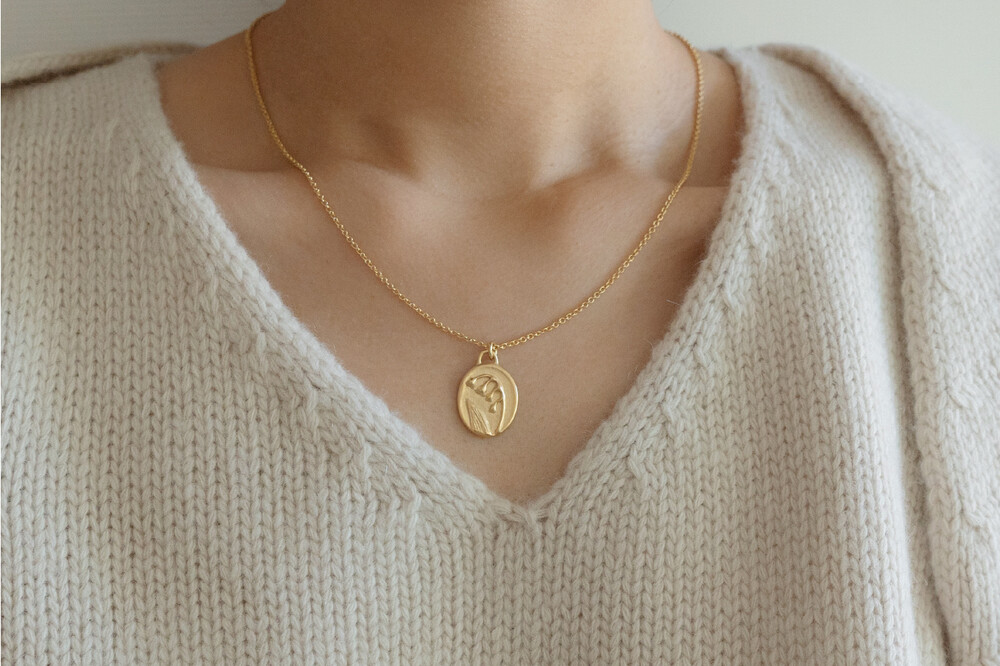 임상아 작가가 만든 포에지의 시그너처, 은방울꽃 목걸이입니다. 작가는 여린 줄기에 작은 종 모양의 꽃망울이 매달린 은방울꽃을 오벌 프레임에 담았습니다. 목걸이는 기본 U 네크라인 티셔츠와 셔츠에 잘 어울리고, 여분의 체인을 사용해 길이를 늘이면 터틀넥이나 풀오버 위에 걸치기 좋습니다. 누군가의 귀한 순간을 기념하고 싶을 때 이 목걸이를 목에 걸어주세요. '틀림없이 행복해집니다'라는 축복의 의미를 지닌 은방울꽃 오브제가 오랜 시간에 걸쳐 맑고 단정하게 살아갈 용기를 줄 겁니다.