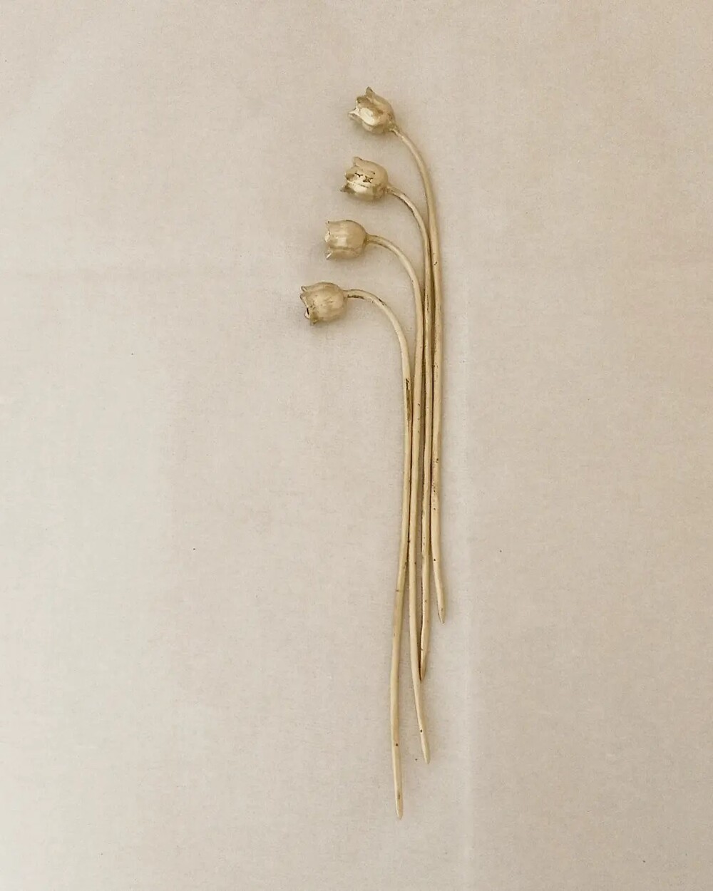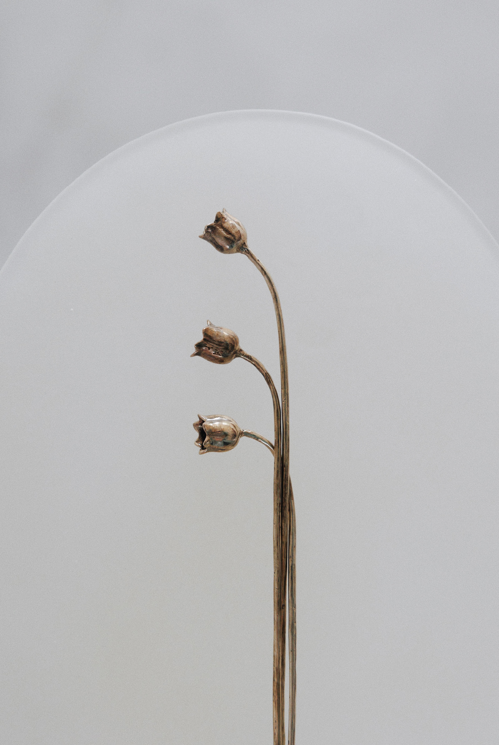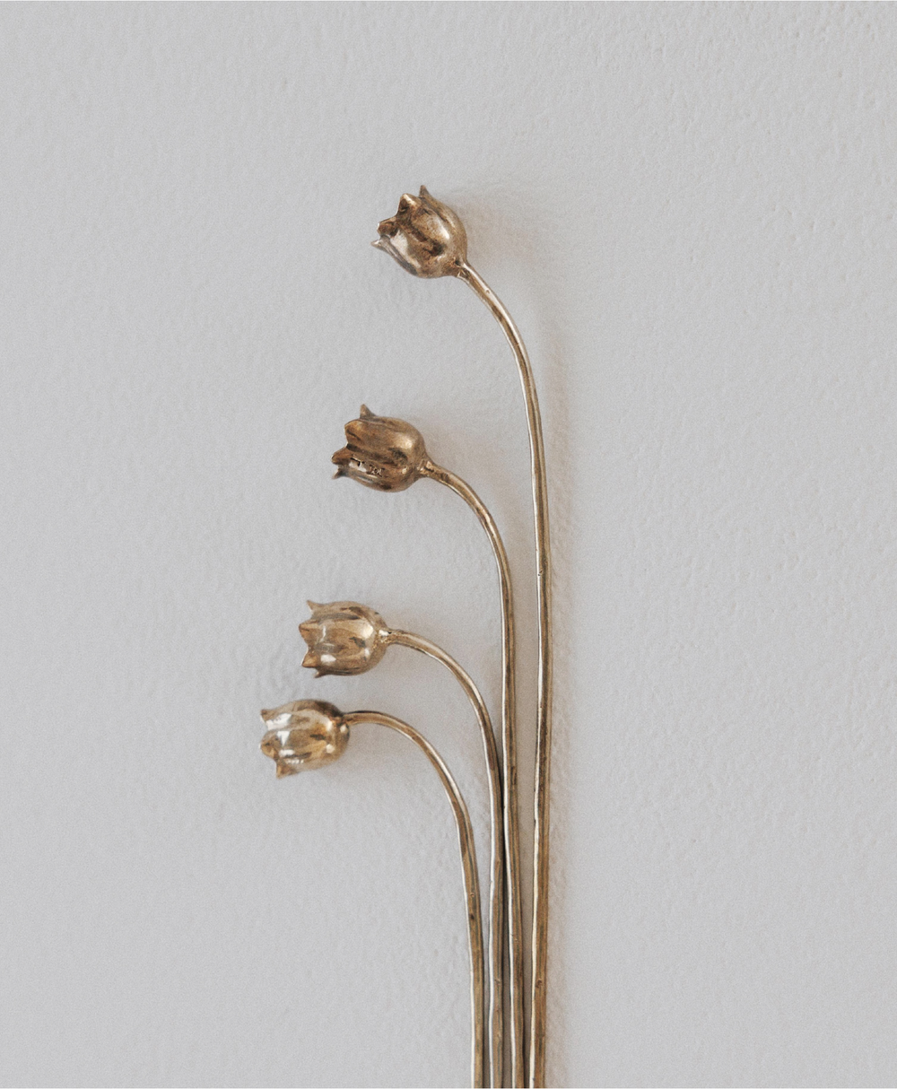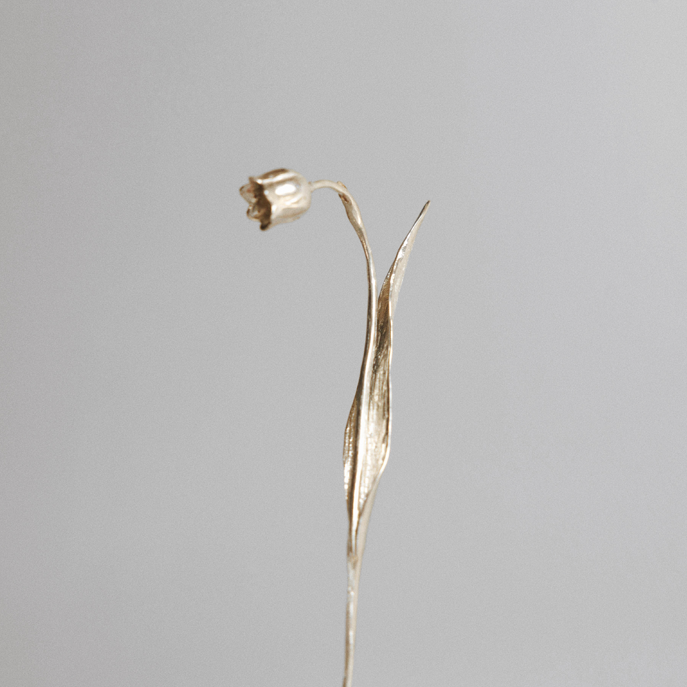 F : 왁스로 은방울꽃을 만든 후 은(차시와 주얼리)과 황동(디저트 픽), 주석(책갈피)을 녹여 주조하여 만들었습니다. 십 대 시절 은방울꽃을 자주 그렸는데 이렇게 오랜 시간이 지나 만들게 되어 기쁘고 신기했습니다. 포에지와 은방울꽃에 대해 이야기를 나눌 때 아늑하고 시적인 느낌으로 다가왔습니다. 포包와 비슷한 맥박이라고 할까요? 포와 결과 궤가 같다고 느꼈어요. 늘 금속으로 시를 쓰고 싶었지만 글을 잘 쓰지 못한다는 것도 또 하나의 이유였지요. 'Poesie'는 그야말로 시를 의미하니까요.