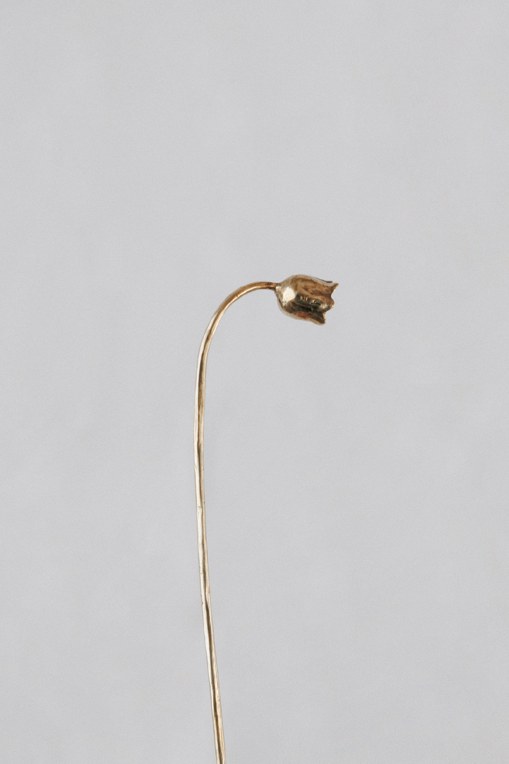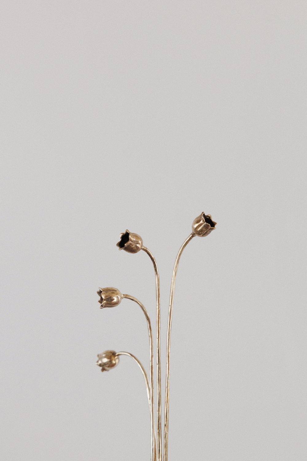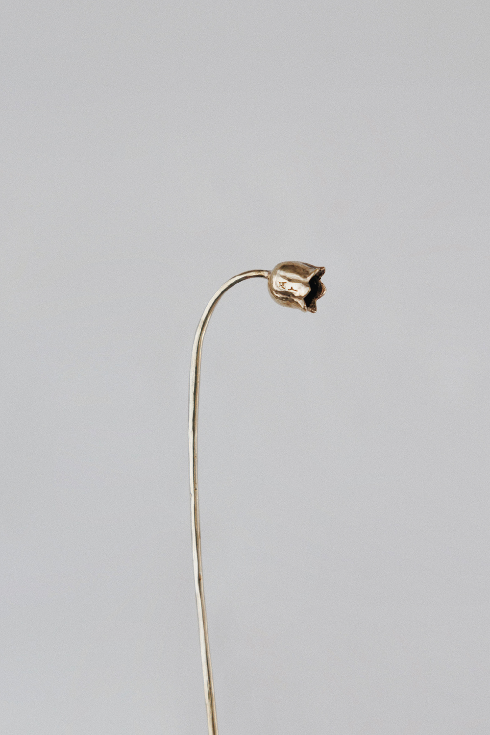 F : 왁스로 은방울꽃을 만든 후 은(차시와 주얼리)과 황동(디저트 픽), 주석(책갈피)을 녹여 주조하여 만들었습니다. 십 대 시절 은방울꽃을 자주 그렸는데 이렇게 오랜 시간이 지나 만들게 되어 기쁘고 신기했습니다. 포에지와 은방울꽃에 대해 이야기를 나눌 때 아늑하고 시적인 느낌으로 다가왔습니다. 포包와 비슷한 맥박이라고 할까요? 포와 결과 궤가 같다고 느꼈어요. 늘 금속으로 시를 쓰고 싶었지만 글을 잘 쓰지 못한다는 것도 또 하나의 이유였지요. 'Poesie'는 그야말로 시를 의미하니까요.