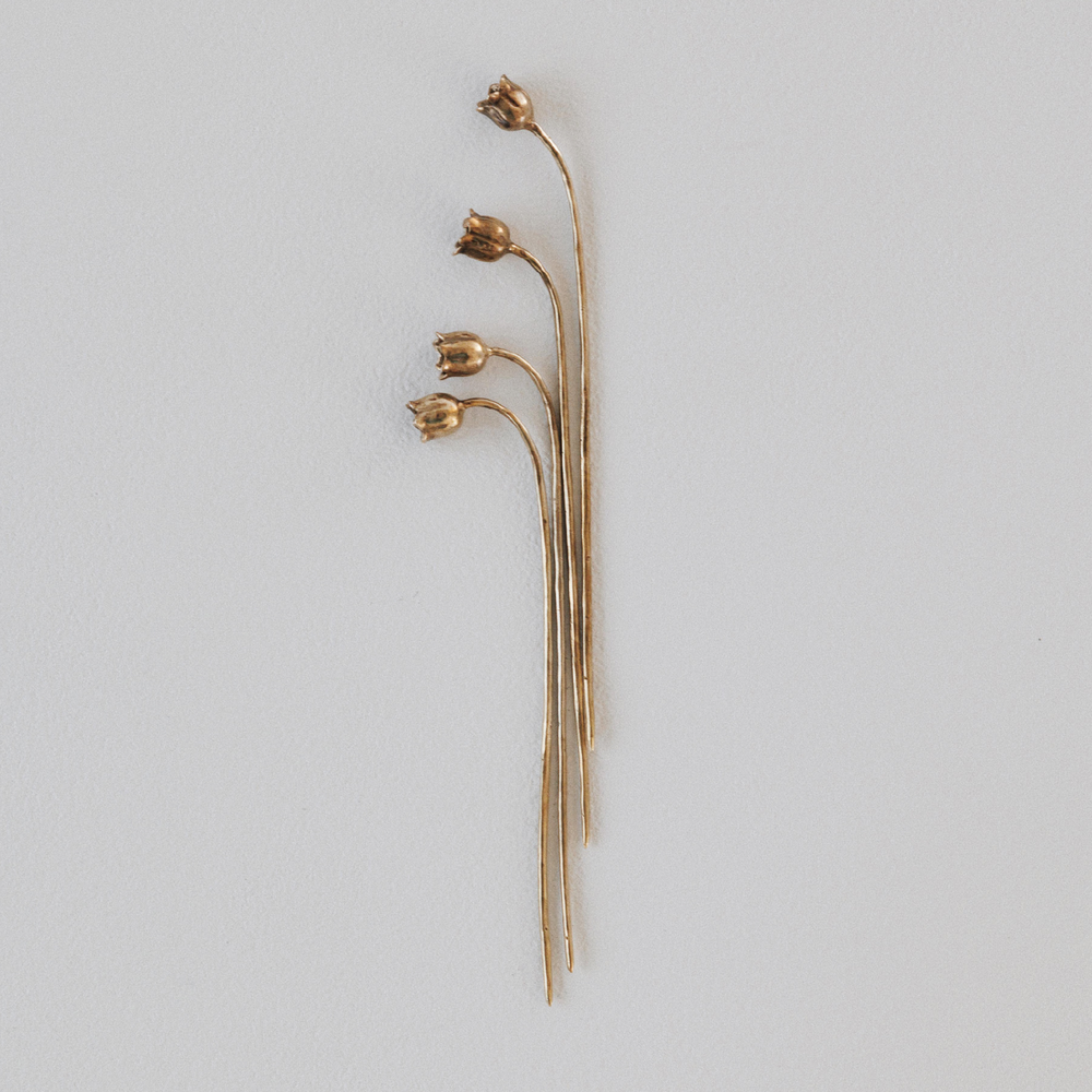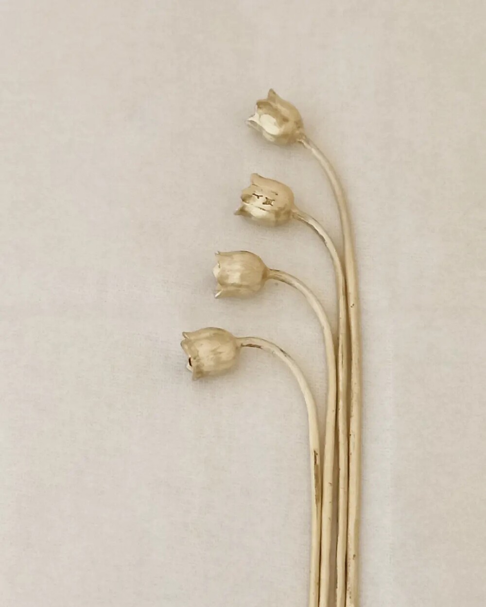 F : 작은 볼륨을 지닌 은방울꽃의 형태나 움직임이 일상에서 아름답게 표현될 수 있는 사물을 생각했습니다. 또한 그 정서가 자연스럽게 금속에 녹아들어 잘 표현할 수 있는 용도로요. 작은 은방울꽂 차시를 선택한 사람의 고운 정서를, 4개의 은방울꽃 디저트 픽이 모여 만들어내는 자연스러운 운율감을, 귓가에서 작게 흔들리는 장신구의 기분 좋은 느낌을 떠올렸습니다.