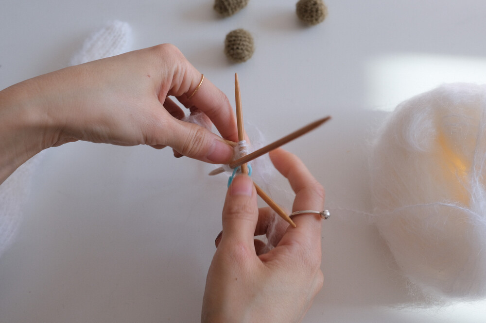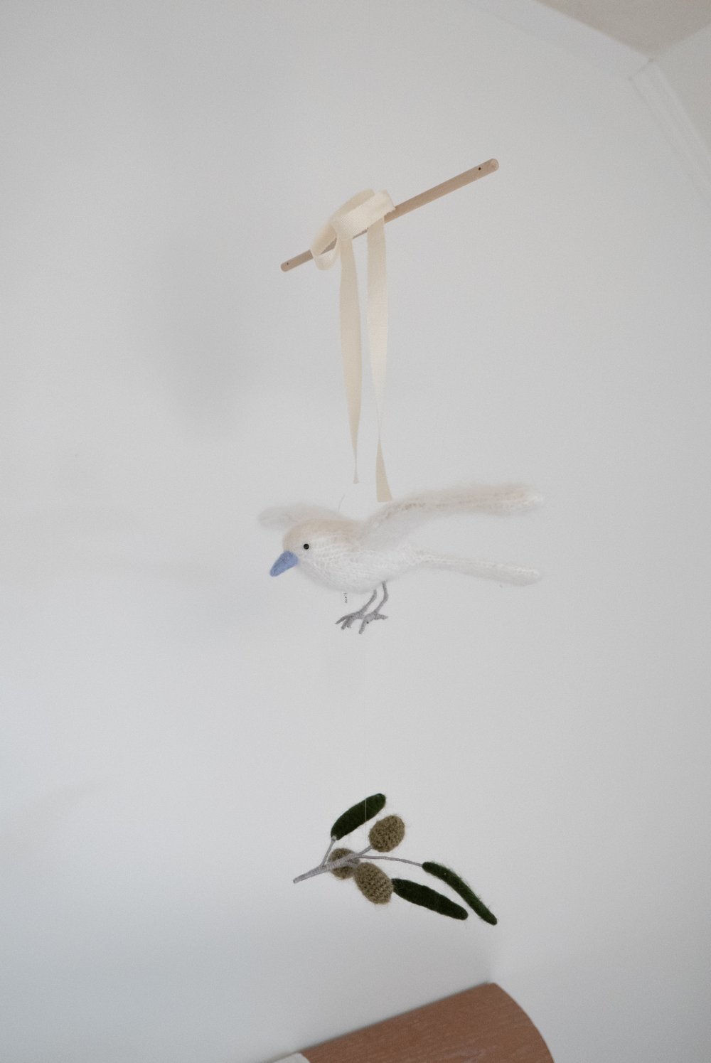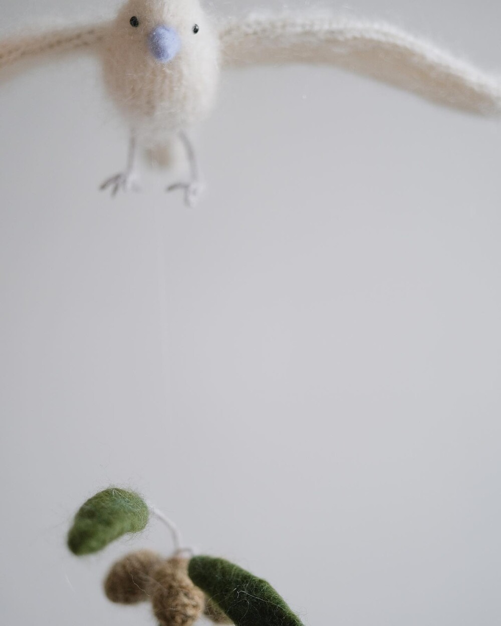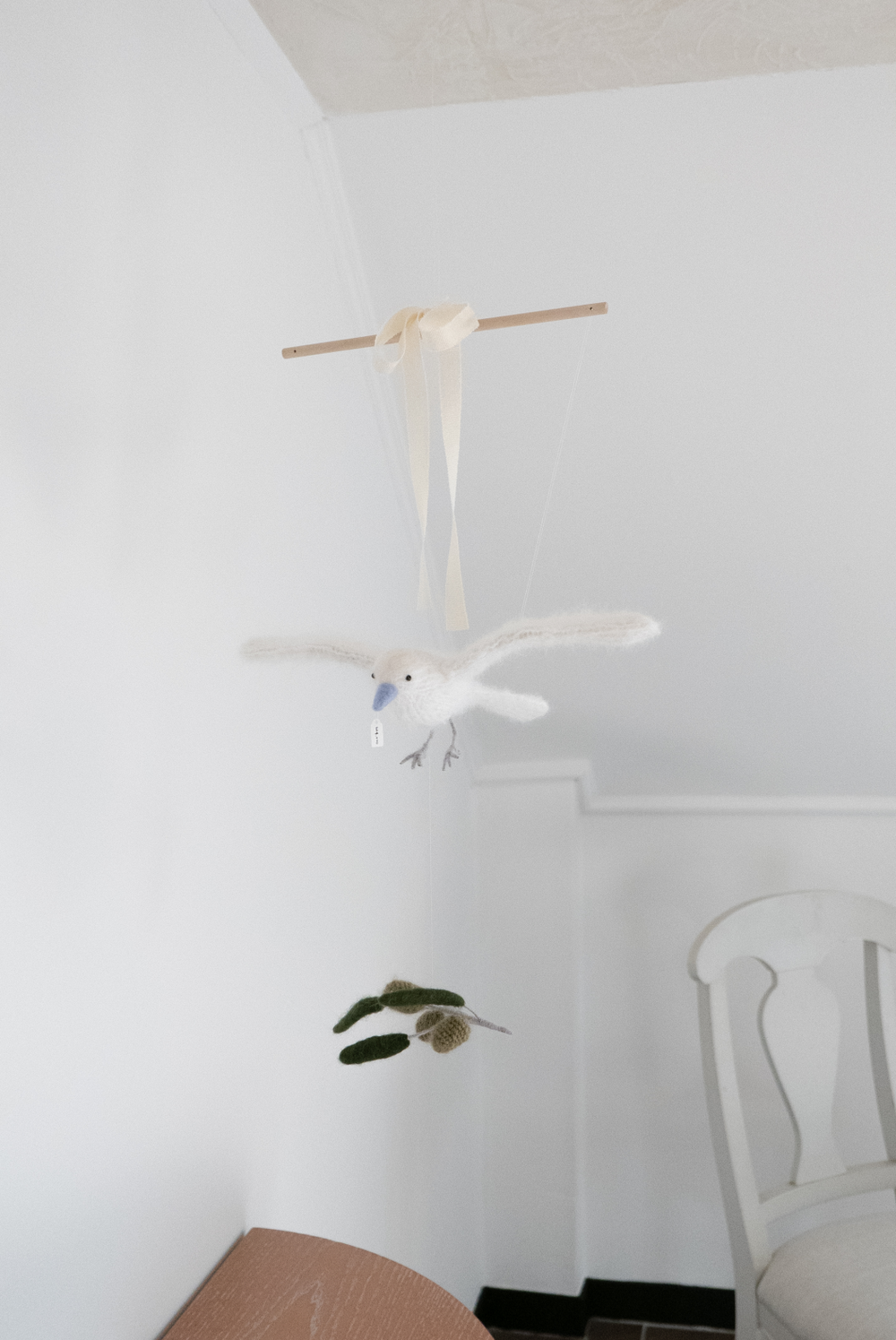 한 예로, 하얀 새를 만든 실의 경우-기모가 없는 백색의 실, 기모가 많은 아이보리 색상의 실, 얇고 섬세한 실, 도톰하고 부드러운 실 등 굉장히 다양한 실로 실험을 해보았어요. 같은 형태여도 어떤 실로 뜨느냐에 따라 새의 느낌이 완전히 달라졌거든요. 또 새의 흰 빛에 맞춰 올리브나 잎 색상도 가장 깨끗하고 포근하게 조화되게 하기 위해 수많은 배색 옵션을 두고 샘플 작업을 했습니다. 결과적으로 포에지의 톤을 잘 반영하면서도 제 느낌이 잘 담긴 것 같아요.