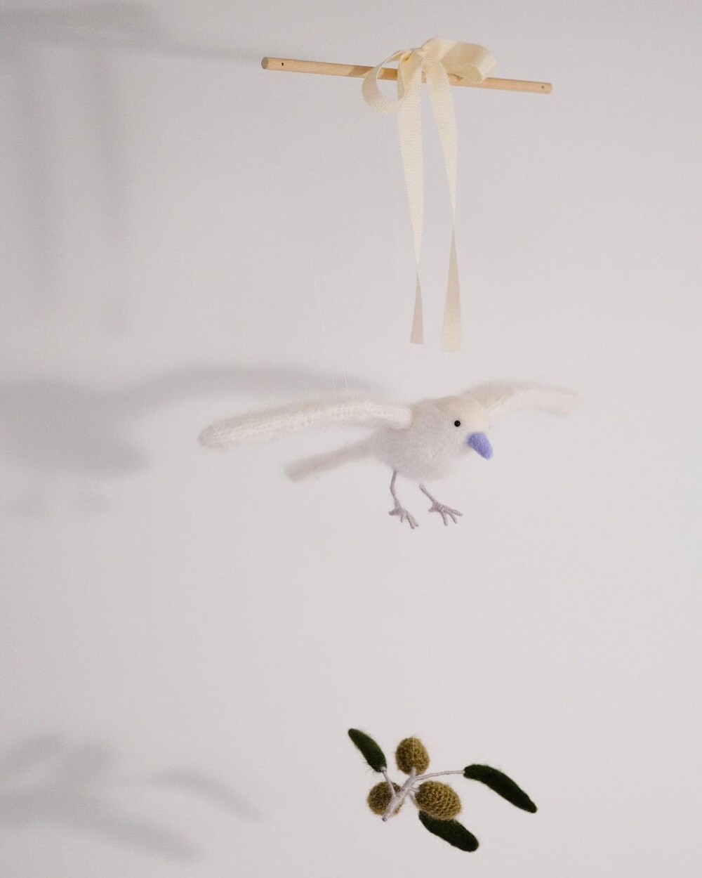핸드메이드 브랜드 sarah's moon을 운영하고 있는 안신영 작가의 모빌입니다. 작가는 2004년부터 단순히 심미성이 돋보이는 작품을 추구하는 것을 넘어 작업에 어떤 메시지를 담아왔습니다. 포에지와의 협업을 통해 완성된 'Love & Peace'는 작품명처럼 사랑과 평화를 소망하는 마음에서 시작했습니다. 노아의 방주 이야기에서 기반한 작품으로, 40일간의 폭우가 지나고 새가 노아의 방주로 가장 먼저 물고 날아온 것이 바로 이 올리브 나뭇가지입니다. 올리브 가지를 보고 노아는 땅이 마르기 시작했다는 것을 알았습니다. 이 말은 비로소 평화가 도래했다는 뜻이었습니다.
