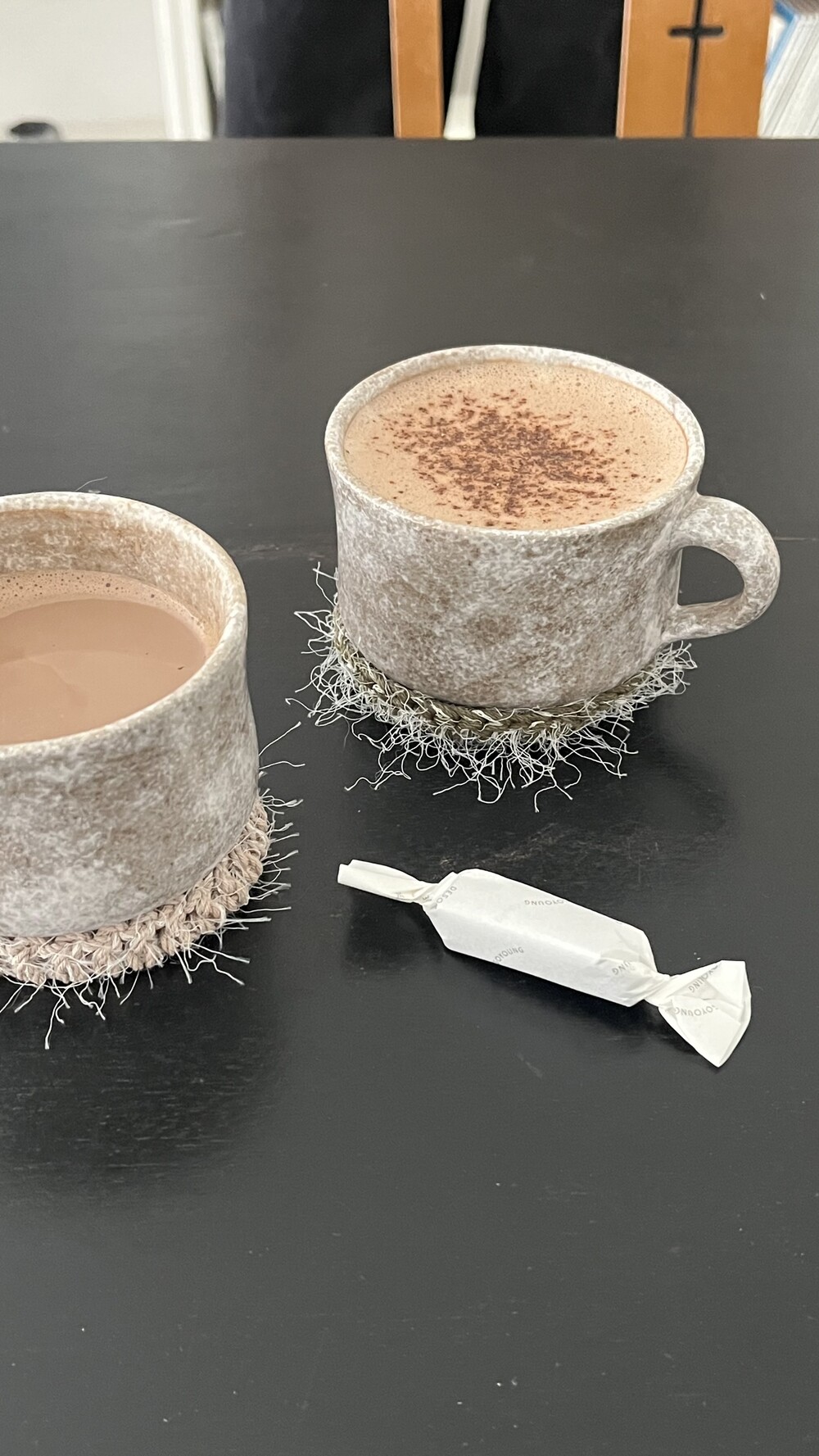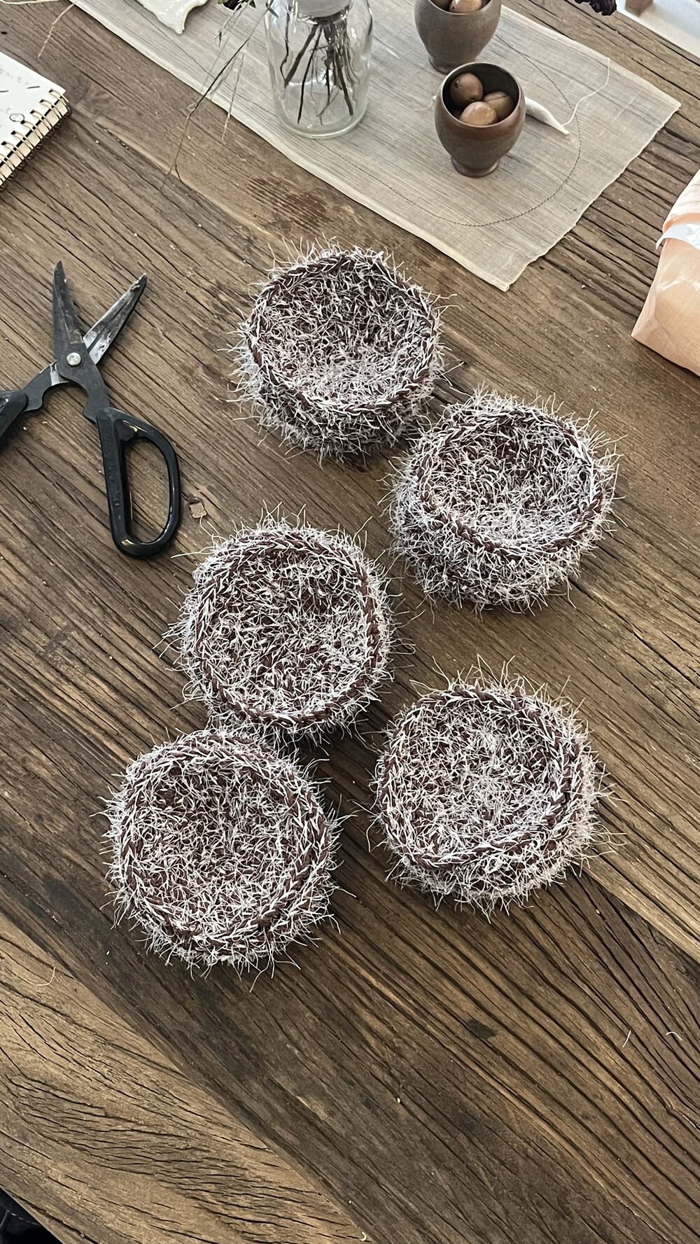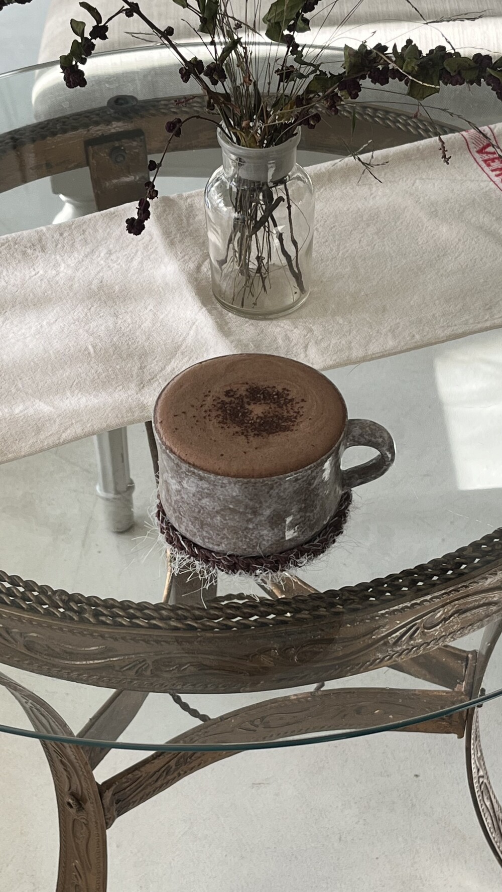 오수 작가는 눅 머그에 어울리는 코코아 컬러의 코스터를 특별히 작업해주었습니다. 두 가지의 실을 합사해 조직해 나풀거리는 둥지는 어떤 물건도 아늑하게 품어줍니다.